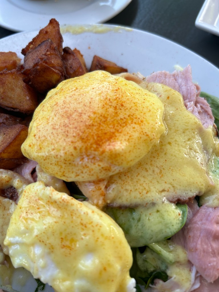 Modern American cuisine — English muffin, browned ham, greens with a poached egg laid gently on top enveloped in a creamy Hollandaise sauce plus a side of roasted potatoes.
